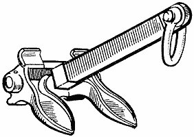 Во второй конструкции якоря Шедлинга вместо косых штоков в нижней части лап сделаны широкие крылья, стабилизирующие работу якоря на каменистых грунтах. Разворот лап ограничивается уступами, которые одновременно служат захватами для начального поворота лап в сторону грунта. После появления якоря Дэнфорта в США запатентовано несколько подобных якорей, среди которых самыми удачными считаются якоря, разработанные инженером Шипли (рис. 125).