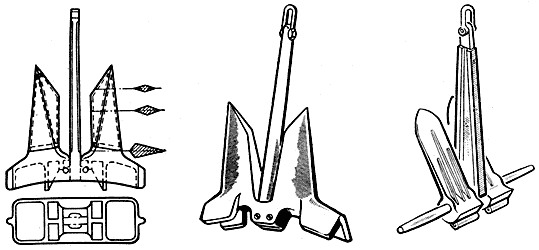 - На большей части рейдов, где судам приходится становиться на якорь, под слоем рыхлого грунта - ила, песка, ракушечника - есть более плотный и твердый грунт. Держащая сила втяжных якорей типа Холла даже с очень длинными и широкими лапами на мягких и рыхлых грунтах часто оказывается недостаточной для надежной якорной стоянки. На совсем рыхлом грунте, скажем на жидком иле, такие якоря "плывут" - протаскиваются под натяжением якорь-цепи с лапами, откинутыми вверх.