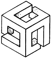 Все поверхности должны быть чистыми и красивыми, чтобы сувенир было приятно взять в руки. После расточки сквозных отверстий на всех сторонах куба расточным резцом делаются выточки под прямым углом. Выточки делаются несколько большего диаметра, чем ранее просверленные и расточенные отверстия. Потом берут расточной прямоугольный резец, заточенный, как обычный отрезной, только внутренний, а не наружный. Этим резцом прорезают канавку в каждой из шести выточек. Естественно, что соответствующей глубины канавки, сделанные таким резцом, будут взаимно перпендикулярны, и таким образом, после прорезки последней канавки внутри нашего куба будет свободно болтаться отрезанный со всех сторон другой куб, меньшего размера.