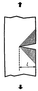 Рис. 29. Распространение трещины Гриффитса. С распространением трещины материал в заштрихованных областях разгружается, освобождая упругую энергию На другой чаше наших энергетических весов расположилась поверхностная энергия 2Gl, которая необходима для образования двух новых поверхностей. Очевидно, эта энергия пропорциональна первой степени длины (или глубины) трещины. Величины поверхностной энергии двухмикронной и одномикронной трещин отличаются лишь в 2 раза, в то время как величины освобожденной энергии деформации - в 4 раза. Последствия такого взвешивания достаточно ясны. Мелкая трещина для своего роста должна больше потреблять поверхностной энергии, чем производить свободной энергии вследствие релаксации напряжений. Эти условия невыгодны для роста трещины. Однако, если исходная трещина достаточно велика, картина изменяется на противоположную: с ростом размеров величина освобожденной энергии увеличивается быстрее, она ведь зависит от квадрата длины трещины. Получается, что, если длина трещины превышает некоторую “критическую длину Гриффитса”, трещина производит больше энергии, чем потребляет. Тогда она может с громадной скоростью рвануться вперед, и процесс этот будет подобен взрыву. Для каждой величины напряжения в данном материале существует своя критическая длина Гриффитса. Для теоретически максимальной величины напряжения (теоретической прочности) критическая длина бесконечно мала, для материала, свободного от напряжений, она бесконечно велика - иного мы и не должны были ожидать. К сожалению, для тех напряжений, с которыми нам приходится обычно иметь дело, критическая длина трещины, как правило, очень мала, порядка нескольких микрон, и, конечно, она уменьшается, когда мы пытаемся увеличить напряжение. В этом заключается одна из трудностей, связанных с получением более прочных материалов.