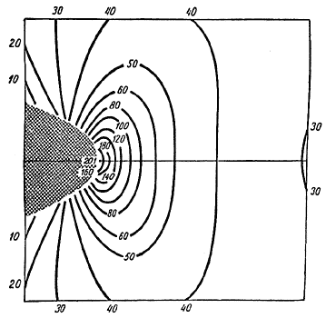 Рис. 32. Концентрация напряжении вблизи кончика эллиптической трещины. Растягивающие напряжения направлены параллельно трещине, то есть под прямым углом к направлению приложенной нагрузки. Для этого случая максимальная концентрация составляет около 40 - т.е. пятую часть концентрации, показанной на предыдущем рисунке.Если напряжения, перпендикулярные трещине, достигают максимума на самом се кончике, то напряжение, параллельное трещине (горизонтальное в плоскости чертежа), равно нулю в этой точке. Оно увеличивается с удалением от кончика по горизонтали (рис. 32) и достигает максимума на расстоянии одного-двух атомных размеров от трещины. Но этот максимум размазан, и довольно высокие напряжения сохраняются на значительном расстоянии от трещины. Независимо от формы трещины и способа ее погружения отношение максимальной величины напряжения, параллельного трещине, к максимальной величине напряжения, направленного перпендикулярно ее поверхности, есть величина постоянная и равная приблизительно 1/5. Такое положение имеет, по-видимому, фундаментальное значение для всех трещин, существующих в растянутом материале.