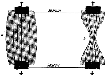 Затем Орован испытал ту же слюду, но на образцах другой формы. Из слюды вырезались прямоугольные пластинки, которые были несколько шире, чем захваты для крепления образцов в машине. Предполагалось, что образец будет нагружен так, как показано на рис. 35, а, то есть кромки его останутся ненагруженными. Наружные плоскости образца, лежащие на пути передачи нагрузки между захватами, должны быть, конечно, полностью нагруженными, а на них - царапины и другие концентраторы напряжений. Но трещины, появившиеся на этих концентраторах, едва начав расти, упираются на своем пути в относительно слабые плоскости спайности.