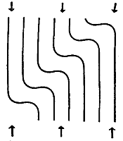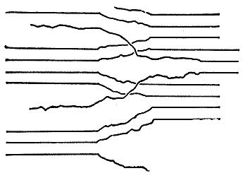 Общая картина напоминает картину, показанную на рис. 18. Немного обобщая ее, мы могли бы изобразить траектории напряжений, то есть направления, по которым напряжения передаются с одной атомной связи на другую, как это сделано на рис. 30. Эта схема поможет нам понять детали картины напряжений, полученной Куком.