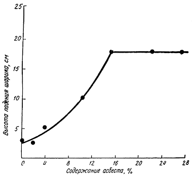 Рис. 45. Влияние добавки волокон на ударную вязкость алебастра (испытание падающим шариком) Рис. 46. Влияние добавки волокон на ударную вязкость фосфатного цемента (испытание падающим шариком) Очевидна очень резкая тенденция к увеличению ударной вязкости, даже совсем небольшие добавки волокна дают весьма ощутимое улучшение. К сожалению, добавка волокон в мокрый алебастр ведет к его быстрому загустению, иногда смесь с 2-3% волокон уже невозможно перемешать. Правда, с этим злом можно как-то бороться, выбирая другие типы цементов и уплотняя полученную смесь под прессом. На рис. 46 показано влияние асбестовых волокон на ударную вязкость фосфатного цемента (этот цемент очень похож на тот, которым пользуются зубные врачи).