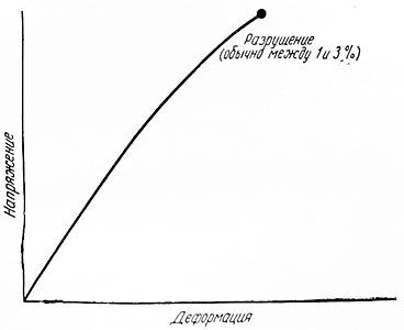 Рис. 47. Кривая напряжение - деформация типичного неметаллического конструкционного материала (например, древесины или стекловолокна). Отклонение от закона Гука определяется, как правило, не формой кривой межатомных сил, а небольшими эффектами ползучести.Торможение трещин дислокациями и коррозия под напряжением