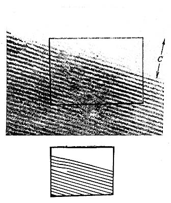 Рис. 51. Первая прямая фотография краевой дислокации, полученной Дж.В. Ментером. Большой размер молекулы фталоцианина платины позволил увидеть в электронном микроскопе расстояние между атомами. Опыты Ментера по визуализации атомных слоев и дислокаций в них с помощью электронного микроскопа были очень убедительными, это сделало их знаменитыми.