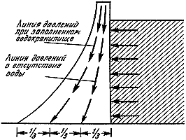 Подобно стенам, каменные плотины обычно разрушаются не из-за недостатка прочности, а из-за недостатка устойчивости - они, как и стены, могут опрокидываться. Боковое давление на плотину со стороны запруженной воды, как правило, сравнимо с весом каменной кладки плотины. Поэтому положения активной линии давлений могут резко меняться в зависимости от уровня запруженной воды. Для плотин в отличие от обычных зданий недопустимы никакие вольности в обращении с правилом "средней трети". Их каменная кладка ни в коем случае не должна содержать трещин, особенно со стороны, обращенной к запруживаемой воде. Присутствие трещины позволило бы воде под давлением войти внутрь конструкции, что повлекло бы за собой два нежелательных последствия. Во-первых, вода повреждала бы каменную кладку. В больших плотинах для предотвращения всякого просачивания воды в тело плотин обычно предусматривается специальный дренаж. Во-вторых, давление воды внутри трещины создавало бы направленную вверх силу (ее величина на глубине 30 м составляет около 0,5 МН/м2), которая в критической ситуации опрокидывает дамбу.