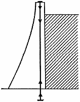 Рис. 65. В результате действия наклонной нагрузки линия давлений отклоняется от плоскости симметрии стены.