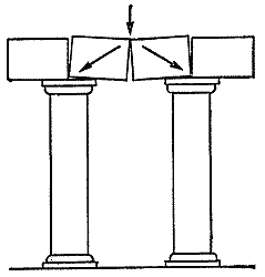 Рис. 79. Короткая каменная перемычка (архитрав) под действием растягивающих напряжений, треснув, превращается и арку с тремя шарнирными точками и продолжает держать нагрузку.Для греческой трабейской * архитектуры требовались очень большие каменные блоки. По мере того как цивилизация приходила в упадок, сложнее становилось перевозить большие грузы, возможно, именно это послужило одной из причин пристрастия средневековых строителей к готическим аркам и сводам, которые можно было строить из камней совсем малого размера.