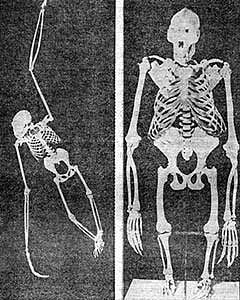 Рис. 81. Скелеты гиббона (слева) и гориллы (справа) иллюстрируют действие закона двух третей: с увеличением размеров животных толщина их ребер и костей конечностей растет быстрее, чем толщина позвоночника.Природа в этом отношении оказалась мудрее римских архитекторов: с увеличением размеров сооружавшихся храмов они отказались от надежного приземистого дорического стиля и стали строить их в витиеватом и великолепном коринфском стиле с тонкими архитравами, которые часто не выдерживали непропорциональных нагрузок.