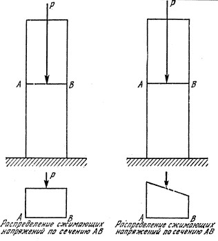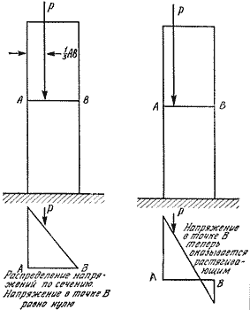 До тех пор пока нагрузка P действует вертикально вниз в плоскости симметрии, то есть посредине стены, кладка будет сжата равномерно и, согласно Гуку, соответствующее распределение сжимающих напряжений по толщине стены также будет равномерным (рис. 58).