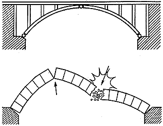 Рис. 75. Появление четвертого шарнира влечет за собой разрушение арки.