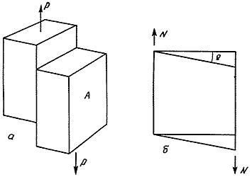 Напряжение сдвига, или касательное напряжение, - t. Как мы уже говорили, касательное напряжение служит мерой тенденции одной части твердого тела скользить относительно другой его части, как это схематически показано на рис. 118, а. Следовательно, если на поперечное сечение материала, имеющее площадь А, действует сдвигающая сила Р, то напряжение сдвига в некоторой точке материала будет (Это среднее значение касательного напряжения. - Прим. ред.):