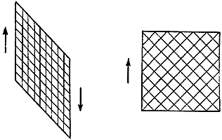 Рис. 122. При растяжении ткани параллельно нитям основы или утка материал оказывается жестким и его поперечное сокращение незначительно.Но если вы теперь потянете ткань под углом 45° к направлению нити, то есть по диагонали, или, как говорят портные, "по косой", то она растянется гораздо больше; можно сказать, что в этом случае модуль Юнга весьма невелик. Одновременно произойдет большое поперечное сокращение, так что в этом направлении величина коэффициента Пуассона станет гораздо больше, а он может достигать величин порядка 1 (рис. 123). В целом же, чем более свободно соткана ткань, тем больше будет различие между ее поведением в диагональном и продольно-поперечном направлениях.