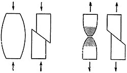Рис. 127. В пластичных металлах наблюдается тенденция к разрушению путем сдвига.