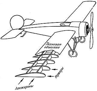 Рис. 129. Крыло моноплана, обтянутое тканью. Когда стало известно о катастрофах с Д-8, командование немецких военно-воздушных сил отдало приказ провести испытания конструкции. Как это обычно делалось в те времена, готовый самолет перевернули вверх ногами и установили на испытательный стенд, нагружая мешками с дробью, расположенными так, чтобы имитировать возникающие в полете аэродинамические нагрузки. Испытанное таким образом крыло не обнаружило признаков слабости, оно разрушалось лишь при нагрузке, эквивалентной шестикратному весу самолета. Правда, в настоящее время требуется, чтобы истребители выдерживали двенадцатикратные перегрузки, но в 1917 г. шестикратной перегрузки считалось вполне достаточно, и она определенно превышала те перегрузки, которые могли возникнуть в тогдашних боевых условиях. Другими словами, самолет, казалось бы, был вполне надежен.