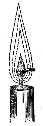 Здесь изображен прилегающий к пламени участок воздуха, играющего существенную роль в образовании пламени и неизменно присутствующего везде, где есть пламя. Восходящий ток воздуха придает пламени продолговатую форму: ведь пламя, которое вы видите, вытягивается под воздействием этого тока воздуха на значительную высоту, как показано Гукером на чертеже линиями, изображающими продолжение воздушного потока.Все это можно видеть, поставив горящую свечу так, чтобы ее освещало Солнце и тень падала на листок бумаги. Как интересно: пламя - предмет сам по себе настолько яркий, что в его свете другие предметы отбрасывают тень, и вдруг оказывается, что можно уловить его собственную тень на белом листке. При этом, как это ни странно, можно вокруг пламени увидеть струйки чего-то, что не есть само пламя, а что увлекает за собой пламя в своем движении вверх.