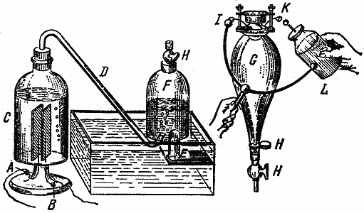 Впрочем, этот газ способен гореть и без доступа воздуха. Вот почему я собрал еще один прибор, приспособленный для того, чтобы сделать опыт более тщательно. Вместо открытого сосуда я взял закрытый. Я хочу показать вам, что этот газ, каков бы он ни оказался, может гореть без воздуха; в этом отношении он отличается от свечи, которая без воздуха гореть не может. Проделаем мы это следующим образом. Вот стеклянный сосуд (G), в который впаяны две платиновые проволочки (I и К), к ним я могу подвести электрический ток. Мы можем соединить этот сосуд с воздушным насосом и выкачать из него воздух, а затем поставить его на банку, соединить с ней и впустить в него тот газ, который образовался в результате воздействия батареи на воду; можно сказать, что мы получили его, превратив в него воду, - я вправе употребить такое выражение и сказать, что мы действительно, по ходу нашего опыта, превратили воду в этот газ.