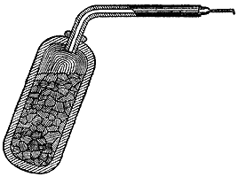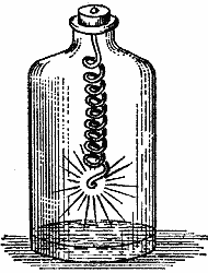 Теперь, познакомившись с этим новым веществом, мы можем исследовать его несколько подробнее, чтобы иметь уверенность в том, что мы в общем хорошо поняли, что собой представляет эта составная часть продуктов сгорания свечи. Способность этого вещества поддерживать горение изумительно велика. Возьмем, например, эту простейшую лампочку, являющуюся своего рода прототипом всякого рода ламп, применяемых для самых различных целей, - для маяков, для освещения предметов, рассматриваемых в микроскоп, и т. д. Если бы понадобилось заставить ее гореть очень ярко, вы бы сказали: "Раз свеча лучше горела в кислороде, то почему бы и лампе не гореть ярче!" Конечно, она будет лучше гореть.