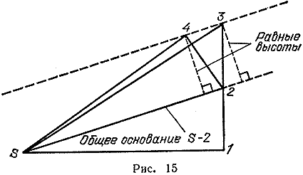Вы помните, что два расстояния 1-2 и 2-3 равны. Вопрос в том, равны ли две площади. Рассмотрим треугольник, образованный Солнцем (S) и двумя точками 1 и 2. Какова его площадь? Она равна основанию 1-2, умноженному на половину перпендикуляра, опущенного на основание из точки S. Теперь - другой треугольник, образованный точками 2, 3 и S. Его площадь равна основанию 2-3, умноженному на половину перпендикуляра, опущенного из точки S. У этих двух треугольников одна и та же высота и, как я уже сказал, равные основания. Поэтому они имеют одинаковую площадь. Пока все идет прекрасно. Если бы со стороны Солнца не действовало никаких сил, то за равные промежутки времени описывались бы равные площади. Но Солнце действует на планету. На отрезке 1-2-3 Солнце притягивает планету, причем направление силы притяжения постепенно меняется. Чтобы получить хорошее приближение, возьмем среднее положение 2 и скажем, что весь эффект притяжения на отрезке 1-3 сводится к отклонению планеты на некоторое расстояние в направлении линии 2- S (рис. 15).