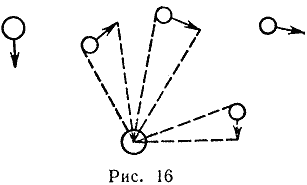На рис. 12 С - Солнце, 3 - Земля. Если бы Солнца не было, то частицы обстреливали бы Землю со всех сторон, барабанили по ней и каждая упавшая частица немного подталкивала бы Землю. Это не сдвинет Землю ни в каком определенном направлении, потому что с одного боку налетает столько же частиц, сколько с другого, снизу столько же, сколько сверху. Однако если Солнце на месте, то оно в какой-то мере поглощает частицы, летящие с этой стороны, потому что некоторые из них, попадая в Солнце, не проходят его насквозь.