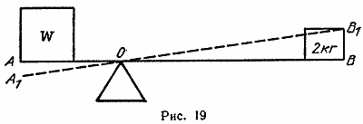 Закон сохранения энергии очень полезен в методическом отношении. Я приведу несколько простых примеров, чтобы показать вам, как, зная закон сохранения энергии и формулы для вычисления энергии, мы можем понять другие законы. Иными словами, многие другие законы не независимы, а являются как бы зашифрованными пересказами закона сохранения энергии. Простейший из них - правило рычага (рис. 19).
