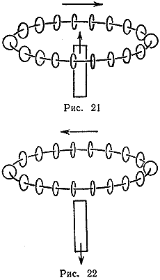 Эта величина не меняется. Итак, мы имеем сохранение момента количества движения. Кстати, многим часто кажется, будто момент количества движения не сохраняется. Подобно энергии, он проявляется в различных формах. Большинство людей думают, будто он связан только с движением, но я покажу вам, что он проявляется и в других формах. Если в проволочную катушку вдвигать магнит, то магнитное поле, магнитный поток внутри нее, увеличится и по проводу пойдет электрический ток. Вообразите, что вместо провода - диск. в котором имеются электрические заряды наподобие электронов в проволоке (рис. 21). Теперь я пододвигаю издалека магнит, вдвигаю очень быстро вдоль оси, точно в середину, и магнитный поток изменяется. Так же как и в проволоке, магнитные заряды начинают двигаться по кругу, и, если диск насажен на подшипник, он закрутится. Это не похоже на сохранение момента: когда магнит далеко от диска, диск не поворачивается, а когда близко - диск крутится.Мы получили вращение задаром, а это против правил. "Ах, так, - скажете вы, - значит, должно существовать какое-то другое взаимодействие, заставляющее магнит крутиться в обратную сторону". Ничего похожего.