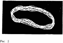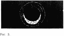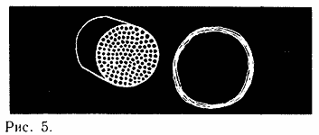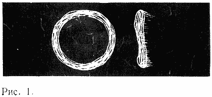 Хотя большие вихри, полученные с помощью описанной установки, лучше всего подходят для демонстрации на лекции, я считаю, что гораздо более красивые и симметричные кольца можно получить, выпуская дым из бумажной или стеклянной трубки диаметром 2,5 см (дым можно получить, например, положив в закрытую коробочку сеющую бумагу.). Если смотреть сбоку на выдуваемые кольца в неподвижном воздухе около лампы или при солнечном свете, то видны очень красивые спиральные линии тока. Мне удалось сфотографировать одно из этих колец следующим образом. Моментальный затвор был установлен на двери темной комнаты, а дуговая лампа фокусировалась на его щель с помощью большого вогнутого зеркала. Фотопластинка устанавливалась в темной комнате так, чтобы ее освещал расходящийся пучок лучей, идущий от отражения дуги в зеркале (когда затвор открыт). Перед пластинкой помещалась красная лампа, а затем кольца выдувались из трубки. Как только кольцо, симметричное по форме и двигающееся не слишком быстро, оказывалось перед пластинкой, мы дергали за шнурок, ведущий к затвору, и пластинка освещалась ослепительной вспышкой. От кольца падала четкая тень благодаря небольшому размеру и отдаленности источника света. Рисунок 2 сделан с полученной фотографии. Видно, что кольцо состоит из слоя дыма и слоя воздуха, образующих спираль из нескольких законченных витков.