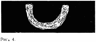 Принимая некоторые меры предосторожности, можно получить дымовое полукольцо такое, как на рисунке 4. Это блестящая иллюстрация того, что образование колец никоим образом не зависит от наличия дыма. Лучший способ получить полукольца состоит в том, чтобы очень легко выдохнуть дым в бумажную трубку, позволяя ему течь по дну трубки, пока он не достигнет конца. Тогда кольцо выталкивается легким выдохом. Возможно, лучше проводить опыт в большой аэродинамической трубе с отверстием на дне, так как в этом случае можно наблюдать явления, происходящие внутри. Достаточно легко получить кольцо, в котором большая часть дыма сосредоточена в нижней половине; но получение кольца, одна половина которого полностью невидима, и такого, чтобы граница дыма была резко очерчена (как показано на рисунке 4), требует большой практики. Я перепробовал различные схемы, чтобы получить эти полукольца в большом масштабе, но ни одна из них не дала результатов, достойных упоминания. Казалось, что применение раскаленной проволоки с нашатырем является самым многообещающим методом, однако резко очерченной границы дыма я так и не получил, а именно это отличает маленькие кольца, полученные с помощью трубки.