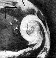 Самые большие скорости ветра в урагане наблюдаются вокруг так называемого "глаза бури" - зоны покоя в центральной части урагана. Черное пятно правильной формы на рисунке 3 - это и есть глаз бури. Выразительное описание глаза урагана дает очевидец, пролетевший через тайфун на самолете метеослужбы - французский журналист П.А. Молэн, автор книги "Охотники за тайфунами".