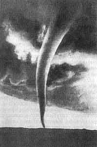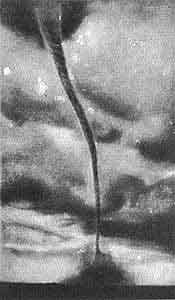 "Мы летим на высоте 3 км в колодце диаметром 22 км, в котором плавает несколько перистых облаков, мирных, как игрушки. Стены этого колодца представляет недвижимая буря, удерживаемая таинственной причиной. Она наполнена кипящими облаками, охваченными жесточайшими конвульсиями. Когда самолет кренится на виражах, глаза поднимаются к верхушке стены, выходу из этого колодца в 15 км над нами. И перед нашим удивленным взором развертываются эти кипящие стены, эта гигантская бездна, это крупное отверстие, которое и заставило назвать все явление «глазом тайфуна»".Заметим, что внетропические циклоны "глазом" не обладают.Еще четче зона покоя (полость) выражена у мелкомасштабных вихрей - смерчей (торнадо, тромбов) (Рис. 4). Размеры их очень малы: ширина - от нескольких метров до 2-3 км, в среднем 200-400 м, высота от нескольких десятков до 1500-2000 м, в среднем несколько сот метров. Скорость ветра в смерче иногда превышает звуковую (1200 км/час).