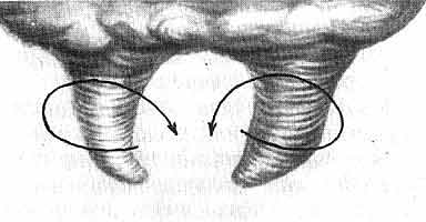 В самом деле, даже на самый "грубый" вопрос - в какую сторону будет вращаться смерч - нельзя ответить однозначно. При громадной скорости движения внутри мелкомасштабного вихря периодический процесс суточного вращения Земли может оказаться слишком медленным, чтобы активно взаимодействовать с процессом быстрого внутреннего движения, и развитие такого мелкомасштабного вихря будет определяться только конкретными внутренними условиями в газе. Они же будут определять направление вращения вихря. Поэтому, если большие вихри Северного полушария - внетропические циклоны и ураганы - вращаются против часовой стрелки, то для смерчей того же полушария не исключается вращение по часовой стрелке.
