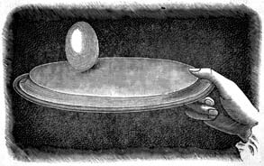 Положи крутое яйцо на донышко подноса (оно должно быть совершенно гладким) и придай подносу горизонтальное вращательное движение, все ускоряя и ускоряя вращение. Яйцо, лежащее на середине подноса, будет увлечено этим движением и начнет вращаться вокруг собственной оси все быстрей и быстрей. Понемногу оно поднимется и остановится на одном конце, вращаясь, как волчок. Для того чтобы лучше удавались опыты с "колумбовыми" яйцами, нужно варить их с хитростью: яйцо должно быть установлено в кастрюле вертикально; тогда воздушная камера под скорлупой расположится симметрично по отношению к длинной оси, и во время опытов легче будет добиться равновесия. Если тебе все же не удастся заставить яйцо танцевать по подвесу, вот уловка, облегчающая этот опыт. Положи поднос на стол так, чтобы он выступал за край и его можно было сразу подхвапить. Поставь яйцо посредине, придерживая его большим пальцем левой руки и указательным пальцем правой. Одним быстрым движением заставь яйцо вращаться, потом подхвати поднос и легкими толчками поддерживай вращение яйца. |