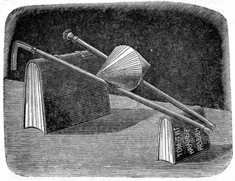 Этот опыт с первого взгляда противоречит законам тяжести. Склей основаниями два картонных конуса. Устрой наклонную плоскость, положив две палки на две книги разной высоты. Не забудь их раздвинуть, чтобы расстояние между палками на большой книге было больше, чем расстояние между палками на маленькой книге. Положи теперь свою картонную фигуру на палки. Зрителю покажется, что конусы катятся кверху. Он ошибется, конечно, потому что палки раздвинуты под углом, и ось конусов, на которой находится их центр тяжести, не повышается, а понижается. Так что на самом деле конусы будут катиться не кверху, а книзу. |