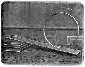 Сейчас два конуса катились у нас вверх по наклонным палкам. Да.вай сделаем еще один опыт, который на первый взгляд противоречит законам тяжести. Из плотной бумаги или из тонкого картона склей кольцо; на внутреннюю сторону его приклей пломбу или просто кусочек сургуча. Поставь кольцо вертикально на наклонную плоскость так, чтобы пломба находилась около вертикального диаметра кольца со стороны, обращенной к приподнятому краю наклонной плоскости. Отпусти кольцо, и благодаря дополнительному грузу твое кольцо покатится вверх по скату, Когда пломба опустится до наклонной плоскости, кольцо остановится в этом положении. Если ты склеишь круглую коробку и груз упрячешь внутрь, зрители будут ахать и охать, не понимая, почему эта коробка катится вверх по склону. |