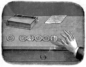 В физических кабинетах этот опыт показывают, пользуясь рядом шаров из слоновой кости, подвешенных на тонких нитях. А нам хватит нескольких двугривенных. Разложим их на столе рядком на одной линии так, чтобы они прикасались друг к дружке. Одну из монет отведём в сторону и толкнём так, чтобы она скользнула по столу и ударила в крайнюю монету ряда. Толчок благодаря упругости монет передастся по всему ряду, и последний двугривенный оторвется и отъедет в сторону. Если ударим двумя монетами сразу, две монеты оторвутся от ряда. Нужно только, чтоб стол был очень скользким и удар был направлен точно. Немножко тренировки - и опыт удастся отлично. |