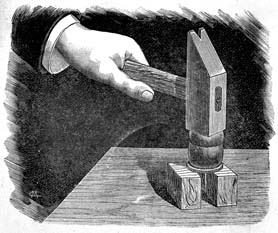 Кажется, невозможно иголкой, да еще тонкой, пробить трехкопеечную монету. Между тем это совсем негрудно. Достаточно проткнуть пробку иголкой так, чтобы чуть-чуть показалось острие; потом выступающее ушко надрезать напильником и отломить. Если теперь поставить пробку на монету (как у нас на рисунке) и с силой совершенно прямо ударить по пробке молотком, игла легко пробьет монету, потому что сталь тверже сплава, из которого отчеканена монета, а пробка не дает игле согнуться. |