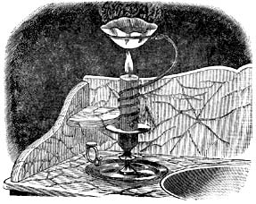 Вырежь из бумаги круг 15 см в диаметре. Один конец толстой проволоки согни в кольцо 7 см в диаметре, другой конец оберни вокруг свечи, как у нас на рисунке. Теперь придай бумаге вогнутую форму и помести эту бумажную чашечку на кольцо так, чтобы по крайней мере на 2 см бумага выступала вад кольцом. Это даст возможность налить в чашечку столько воды, чтобы уровень ее был немного выше проволочного кольца. Это - обязательное условие, иначе не выйдет опыт. Зажги свечу и отрегулируй высоту кольца над огнем; пламя должно слегка лизать самое донышко нашей бумажной кастрюли. |