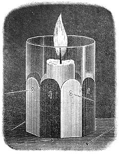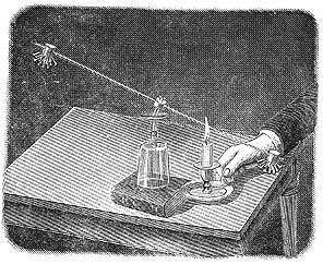 Почему летом мы одеваемся в белое? Потому что белый цвет отражает солнечные лучи, а черный поглощает. Черное платье на солнце нагревается больше, чем белое. Сделаем несложный опыт. Возьмем тонкий стакан, цилиндрический или, лучше, граненый. Закрасим его грани в белый и в черный цвета, чередуя их. Белую краску можно заменить распущенным в воде мелом; для черного цвета лучше всего взять тушь. Допустим, что у стакана 8 граней: 4 белых, 4 черных. Разогреем в пламени свечи головку булавки и погрузим эту головку в стеарин или парафин. Затем, держа стакан горизонтально, а булавку вертикально, головкой книзу, прилепим ее головкой к одной из граней. Когда стеарин остынет, поставим стакан на стол; булавка будет держаться на нем горизонтально. Точно так же приклеим остальные 7 булавок к 7 другим граням. Поставим теперь в стакан, точно на середине, огарок свечи и зажжем его. Фитиль должен доходить почти до уровня края стакана. Стакан начнет согреваться, стеарин будет таять, и булавки станут отклеиваться. Вот упала первая, вторая, третья. Как только упадет четвертая булавка, задуем свечу. Что же оказывается! Отклеились булавки от всех черных граней, а все булавки на белых гранях продолжают держаться. Но ведь свеча бросала на все грани одинаковое количество лучей! Значит, черные грани поглотили больше тепла, чем белые. |